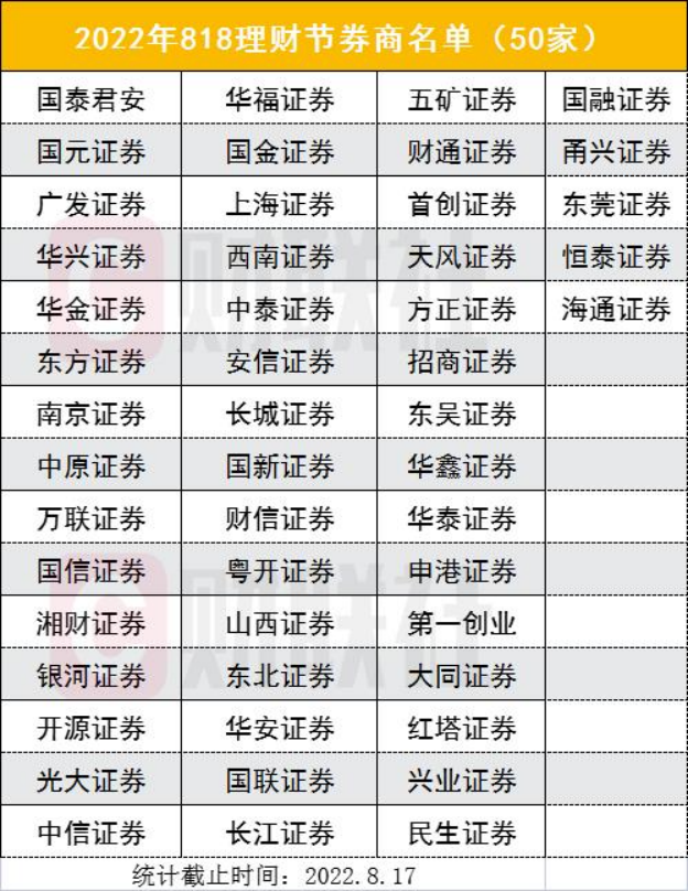 从历年来看,818理财节都是券商的重头戏。截至8月17日,已有50多家券商确认举办818理财节活动,其中既有国泰君安、广发证券等大型头部券商,也有华兴、国新等首次加盟的中小型券商。