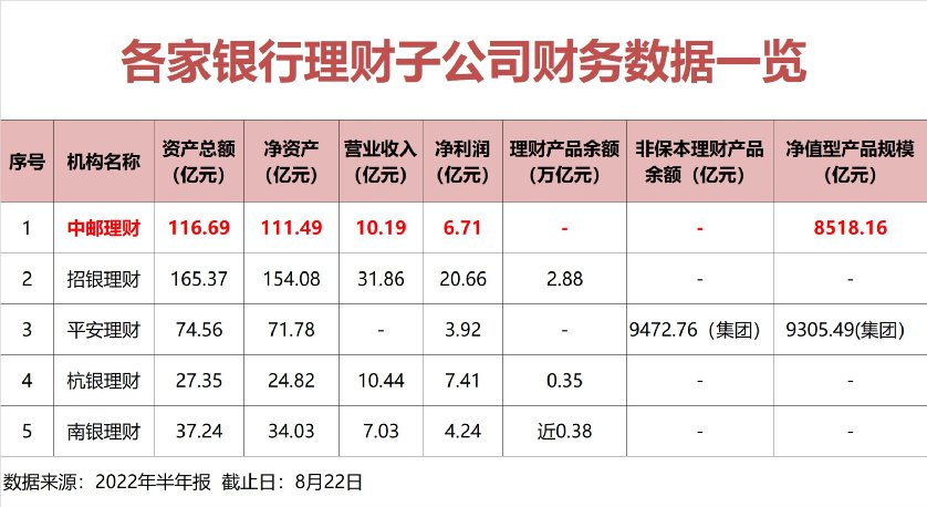 2022年半年度,成立已满2年半的中邮理财也交出成绩单:截至2022年6月末,中邮理财资产总额116.69亿元,净资产111.49亿元;2022年上半年,实现营业收入10.19亿元,实现净利润6.71亿元。